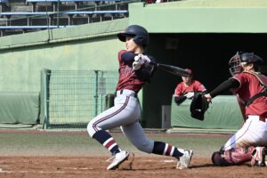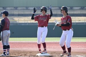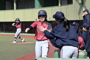 打線は3回まで1安打無得点と相手投手に苦戦。それでも4回に1死から3番・垣中悠希が四球で出塁すると、4番・四方菜桜の打球は相手の後逸を誘い、5番・前川陽優果も四球でつなぎ1死満塁の絶好機。ここで相手投手の暴投で同点に追いつく。さらに6番・岡田悠花はスクイズを仕掛けるも転がすことができずファウルに。それでも坂田監督の「(岡田は)僕がサインを出してミスったら打つんですよね」との言葉通り自ら三遊間を抜ける勝ち越しタイムリーを放ち、この回逆転に成功した。