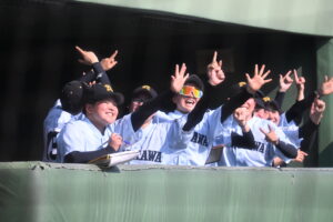 7回表の守備では右アンダースローの網谷紅羽が登板し、2死から3連続四球で満塁のピンチを切り抜けると、7回裏に先頭の小峰がライトへ三塁打を放ち、四球、申告敬遠で満塁に。最後は2番の佐藤が前進守備の内野を越え、センター前に弾き返すサヨナラタイムリーを放ち歓喜の輪ができた。