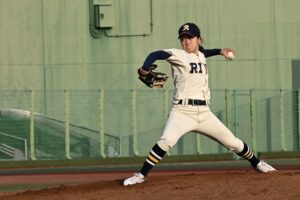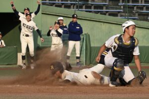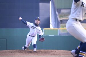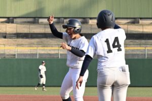 援護をもらった中川は6回以外は走者を出しながらの投球となったが、3回以降は得点を許さず6回を投げ切って降板。7回のマウンドには齋藤來海が上がったが、制球に苦しみ先頭打者への四球から安打でつながれ一、三塁に。ここで一塁へけん制するそぶりを見せてから、三塁へけん制球を投げたが、これがボークとなって3対5に。さらにその後も2つの四球を出したが、ベンチから飛び出した橘田監督の「しっかりせぇ」との檄で笑顔になると、結果的にアウト全てを三振で奪って逃げ切った。
